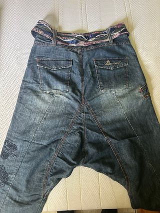 Pantalón vaquero de la marca Desigual. Talla 28 - Diseño con múltiples bolsillos, algunos con cremallera. - Cintura con trabillas y cinturón decorativo. - Cordones de ajuste en la parte frontal. - Estampado floral y de texto en la parte inferior.