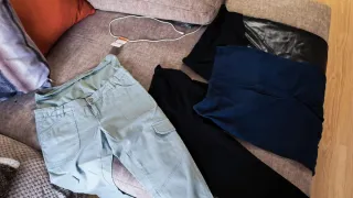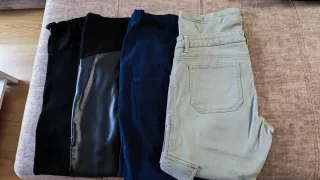 Conjunto de cuatro prendas de ropa para maternidad. Talla 38/40. - Un legging negro. - Un pantalón negro con efecto piel. - Un pantalón azul marino. - Un pantalón verde tipo cargo.