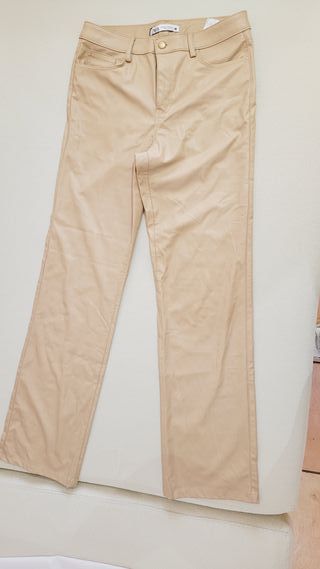 Pantalones de Zara con un acabado que imita la piel. - Talla 38 (M). - Color beige. - Diseño de cinco bolsillos.