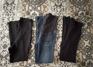 Pack de tres pantalones leggings premamá. Uno de ellos es vaquero y los otros dos son negros. Pantalón tejano skinny H&M 36 Leggins negro H&M y Calcedonia