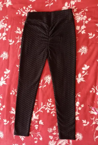 Leggings negros efecto push-up con textura – Segunda mano en muy buen estado 🖤 Leggings de tiro alto con textura efecto nido de abeja, muy elásticos y favorecedores. Cintura alta que recoge y estiliza, con bolsillos laterales y tejido firme tipo “push-up” que realza la figura. 📏 Medidas aproximadas: Largo total: aprox. 93 cm Cintura (en reposo): 33 cm – muy elásticos Tiro alto ✔️ Talla: M ✔️ Composición: 92% poliéster · 8% spandex ✔️ Estado: Segunda mano, muy bien cuidados, sin bolitas ni desgastes. ✔️ Ideales para deporte, gym, correr o para looks casual cómodos.