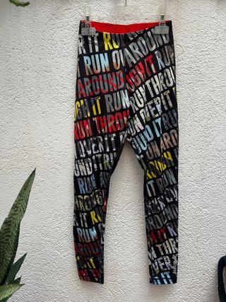 Leggings deportivos con un diseño llamativo y lleno de color. - Estampado integral con texto. - Cintura elástica para un ajuste cómodo. - Tejido flexible para mayor libertad de movimiento.