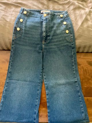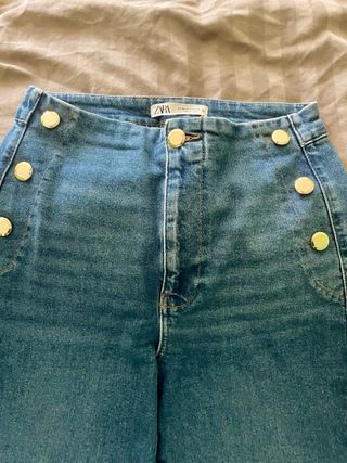 Pantalón vaquero de Zara con un diseño moderno y favorecedor. - Corte ancho. - Detalle de botones dorados en la parte delantera. - Tiro alto.