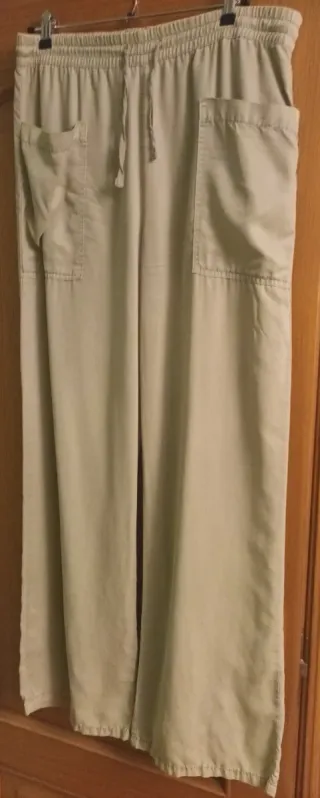Maravillosos Pantalones palazzo de corte ancho y fluido, en un versátil tono verde oliva. Sientan fenomenal. 💖 Tejido liocel. - Cintura elástica con cordón ajustable. - Bolsillos laterales. - Bajo con acabado festoneado.