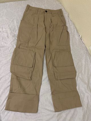 Pantalón de estilo cargo en color beige. Presenta un diseño con múltiples bolsillos. - Cierre de botón y cremallera. - Bolsillos laterales y en los muslos. - Dobladillo ancho en los bajos.