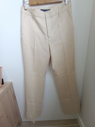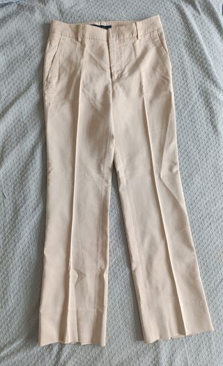 Pantalones de Zara en color beige. Son de tiro alto y tienen un corte recto. Tienen bolsillos delanteros. El tejido es suave y ligero. Están en muy buen estado.