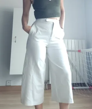 Pantalón de corte ancho en color blanco, tipo culotte.- Bolsillos laterales y traseros Mido 1.65 cm el pantalón lo vendo porque no es mi talla es una XS aunque puede valer para S también.