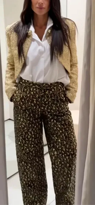 Pantalones de Zara con un llamativo estampado animal print cubierto de lentejuelas. - Diseño de lentejuelas. - Estampado animal print.