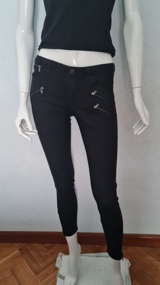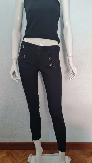 Pantalón negro pitillo con cremallelas en los laterales de la zona de los tobillos y en los bolsillos. Talla 38 de la marca Zara.