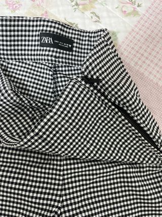 Pantalones de cuadros vicky de Zara, elegantes y en buen estado. - Talla S (equivalente a 36 u 8). - Diseño de cuadros blancos y negros. - Cierre de cremallera.