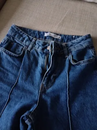 Pantalones vaqueros Zara de color negro. Son de tiro medio y corte recto. Están en buen estado, con un ligero desgaste por el uso. - Talla: (Añadir talla) - Material: (Añadir material) - Cierre: Cremallera
