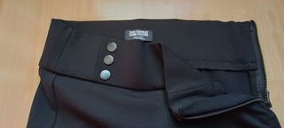 Pantalón de vestir con un discreto estampado de topos. Bolsillos delanteros y cierre con cremallera delantera y botón interior, aunque no se aprecia bien en la primera foto. Bolsillos traseros de adorno. Pequeños lunares blancos sobre fondo negro. Nuevo. Con la cinta de la etiqueta todavía puesta como enseño en las fotos.
