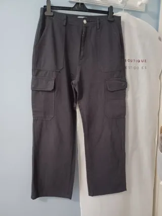 Pantalón estilo cargo en color gris. Diseño moderno y funcional.Cintura ancha.T 42/44 - Bolsillos laterales amplios. - Cintura cómoda. - Corte recto.