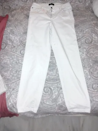 Pantalones blancos de Zara, talla M (equivalente a 38 o 10). Son de corte recto y se encuentran en muy buen estado. - Marca: Zara Basic Collection - Cierre con cremallera y botón - Bolsillos delanteros