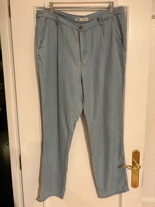 Pantalón de Zara de corte fluido y color azul. - Cintura con trabillas. - Bolsillos laterales. - Cierre de cremallera y botón.