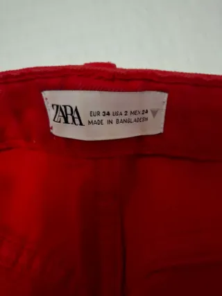 Pantalón de corte recto en color rojo de la marca Zara. - Diseño de tiro alto. - Cierre con cremallera y botón. - Bolsillos delanteros y traseros.