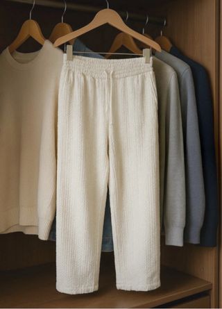 Pantalón de tela con un diseño texturizado en espiga. Es cómodo y versátil. - Cintura elástica con cordón. - Pierna recta. - Tejido suave al tacto.