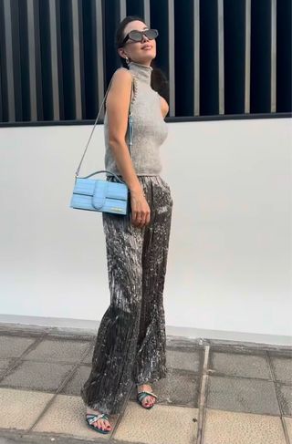 Pantalón de pata ancha en tejido plisado con acabado satinado, cintura alta elástica, detalle de aplicación de lentejas y abalorios a tono.