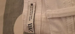 Pantalón vaquero de Zara en color blanco. Presenta un diseño moderno con bajo deshilachado. - Corte recto. - Cintura alta. - Bolsillos delanteros y traseros. - Mirar mínima mancha en última foto