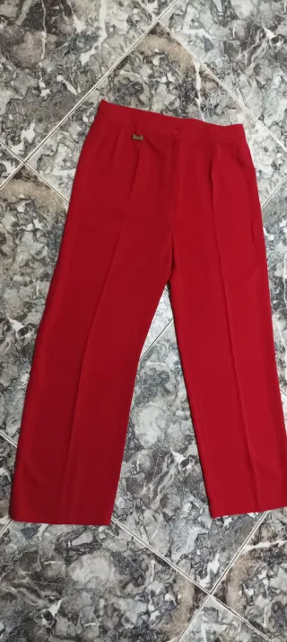 Pantalón de vestir de color rojo. Diseño elegante y clásico. Talla 40 Cadera 48 Cintura 37 Largo 99 - Corte recto. - Cierre de botón y cremallera. - Dos bolsillos laterales.