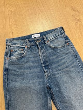 Jeans rectos de Zara en color azul medio. Son de tiro alto y tienen un corte amplio. Modelo Boogie. Tiene el bajo cogido en tienda. Para una altura de 1,71