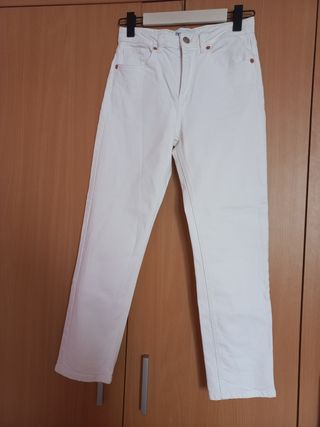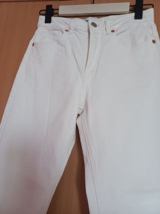 Pantalón blanco roto de Zara, con 2 bolsillos pequeños en la parte de adelante y 2 atrás. Sin estrenar, aunque no tiene la etiqueta. Talla 38. Medidas: 43 cm de cintura, 28 cm de muslo, 23 cm de rodilla, 21 cm en el bajo y 94 cm de largo.
