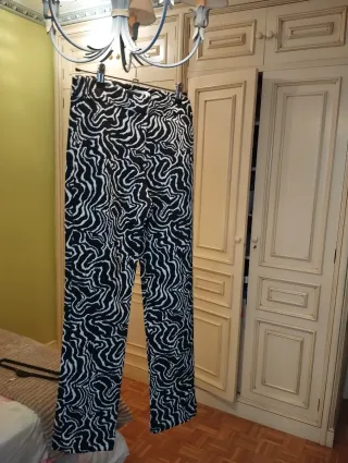Pantalón largo y fluido de Zara con un vibrante estampado.Talla s, pero corresponde a una M. - Diseño con cintura elástica. - Estampado geométrico y floral. - Pierna ancha y caída. - Tejido ligero y cómodo.
