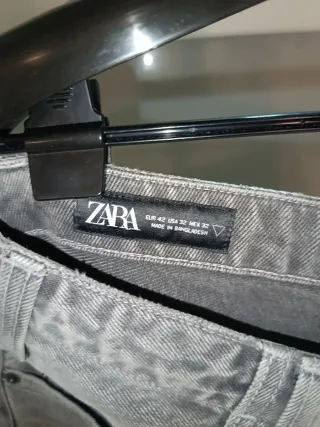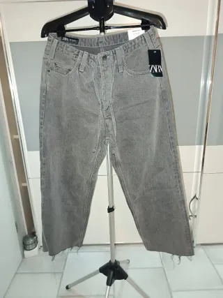 Pantalón de corte baggy de Zara en color gris. Presenta un diseño moderno y cómodo. - Cintura con trabillas. - Cierre de cremallera y botón. - Bolsillos delanteros y traseros. - Bajo deshilachado.