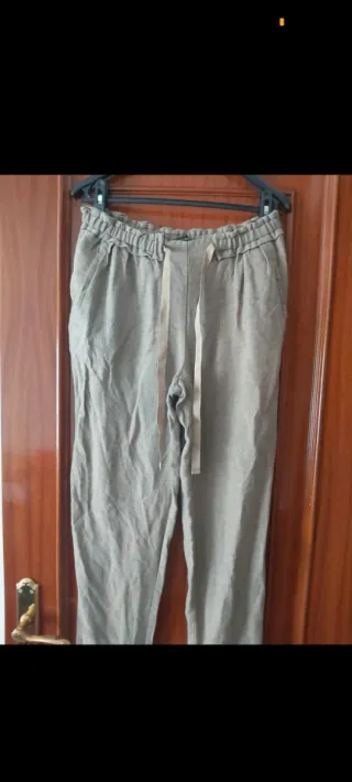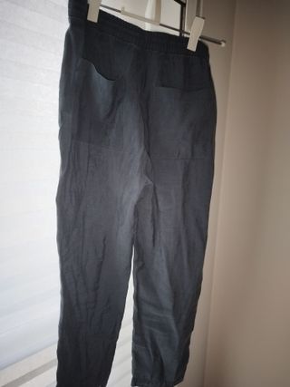 Panatalon de Zara, muy chulo, talle a la cintura, con goma y cordón. Usado pero en buen estado. Bolsillos laterales amplios. Tela ligera y fresca, color gris antracita oscuro con un poco de brillo. Bajos con 2 vueltas pero se puede revertir y dejarlos sin vueltas. Lo vendo porque ya se me queda pequeño. Hago envíos o entrego en mano.