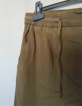 Pantalón de Zara en color verde oliva. Diseño moderno y cómodo. Cintura elástica con cordón. Bolsillos laterales. Talla M.