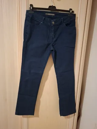 Pantalón vaquero de Zara Woman en color azul marino. Presenta un diseño con detalles de pedrería en los bolsillos traseros. 97% algodón - 3% elastano Solo comunicación por este medio Envíos por wallapop