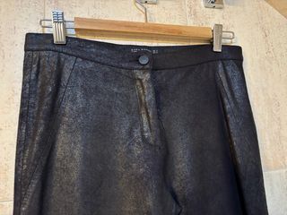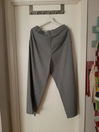 Pantalón tipo palazzo plisado de pernera ancha color gris azulado talla M de la firma Zara. Viene con pliegues en la cintura y es una prenda muy ligera. Mide 38 centímetros de cintura y 110 cm de largo y 53 cm el ancho de la pierna en la parte más baja. Viene con bolsillos y una cremallera para ajustar el cierre del pantalón.