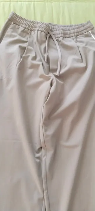 Pantalón de vestir Zara en color beige. - Diseño moderno y elegante. - Cintura elástica con cordón ajustable. - Detalle de raya lateral blanca.