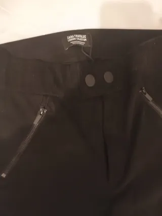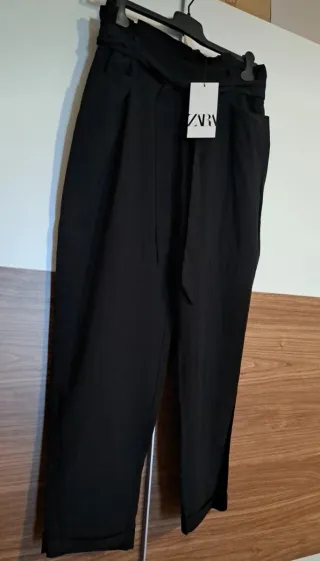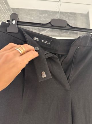 Pantalones de vestir negros de la marca ZARA. - Diseño elegante y versátil. - Cintura con trabillas y cierre de botón y cremallera. - Bolsillos laterales. - Corte recto.