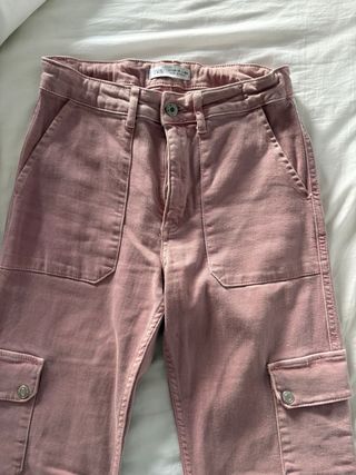 Pantalón de estilo cargo en color rosa de la marca Zara. Diseño moderno con múltiples bolsillos. - Cintura con trabillas. - Cierre de cremallera y botón. - Bolsillos laterales. - Bolsillos de parche en los laterales de las piernas.