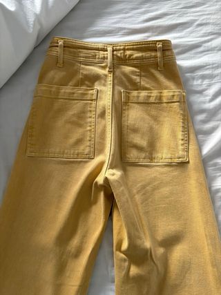 Pantalón de corte ancho de la marca Zara. - Color amarillo vibrante. - Cintura alta. - Cierre de cremallera y botón.