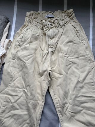 Pantalón estilo baggy de Zara en color beige. Presenta un diseño moderno y cómodo. - Cintura elástica fruncida. - Bolsillos laterales. - Cierre de botón y cremallera.