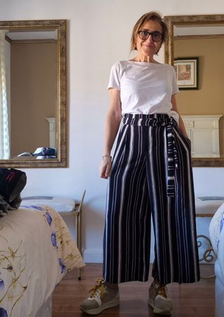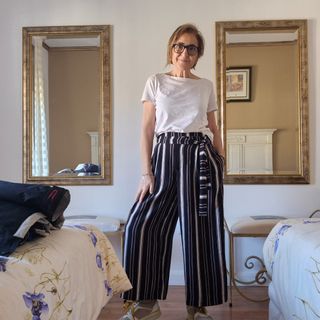 Pantalón Palazzo Zara. Puesto en una ocasión. Tienen goma en la parte trasera, por eso puse medidas desde lo más pequeño hasta lo que da con la goma estirada. da talla desde la 38 hasta la 42, por este detalle. Le quité la etiqueta porque me picaba. Solo lo usé un día.