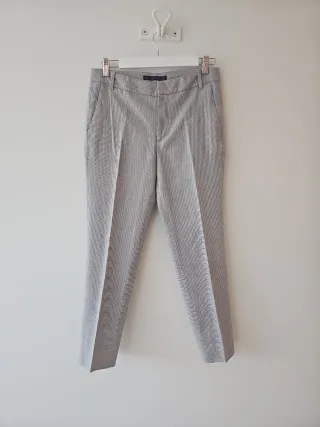 Pantalones de vestir de Zara en color gris. Tienen un diseño moderno y elegante. Talla 34, pero son bastante anchos, puedes ser y talla 36 - Cintura alta con elástico. - Bolsillos laterales. - Bajo con vuelta.