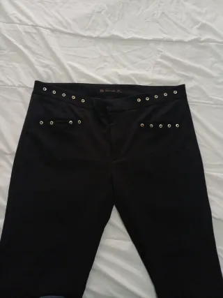 Pantalón de vestir negro de Zara para mujer. Diseño moderno con detalles de ojales. OJO LE FALTA 1 OJALE - Cintura alta. - Ojales decorativos en la cintura y bolsillos.