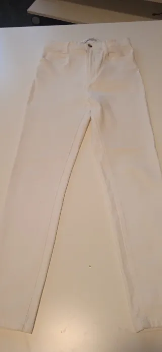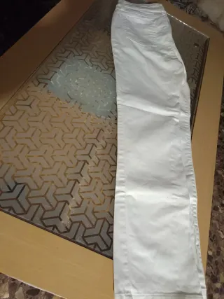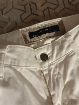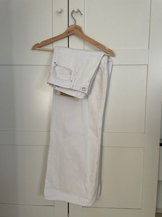 Pantalón de corte moderno en color blanco, usado 4 o 5 veces. Talla 36, pero también vale a un 34. - Diseño de tiro alto. - Cierre con botón y cremallera. - Bolsillos funcionales.