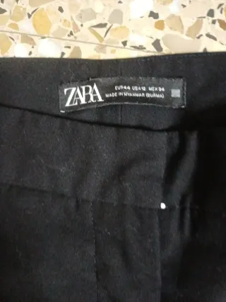 Pantalón de vestir de corte recto. Color negro. Cruzado en la botonadura delantera. Con pinzas muy favorecedoras. Talla S, válida 36-38. Usado una vez, como nuevo. Zara. - Cintura alta. - Bolsillos laterales y de ojal en la parte trasera. - Cierre con cremallera y botón cruzadl.