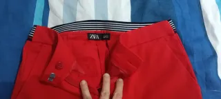 Pantalón de vestir de la marca Zara, en color rojo y talla XS. Es una prenda sin usar. - Corte recto. - Cintura con detalle de banda. - Tejido de poliéster.