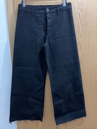 Pantalón culotte de Zara en color negro. Un básico versátil para cualquier ocasión. - Corte ancho y moderno. - Tejido cómodo de algodón y de buena caída. Goma posterior con lo cual ajusta muy bien, cierre delantero con presilla y botón. talla M Zara.