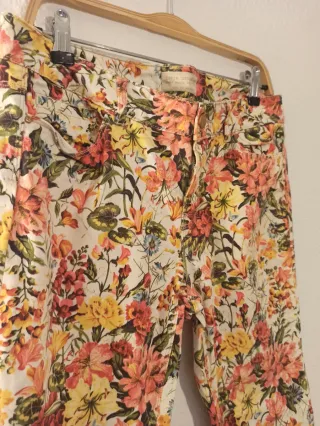 Pantalones de Zara con un vibrante estampado floral. - Diseño de corte recto. - Cintura con trabillas para cinturón. - Cierre de cremallera y botón. En perfecto estado Medidas 42cm de cintura 92cm de piernas