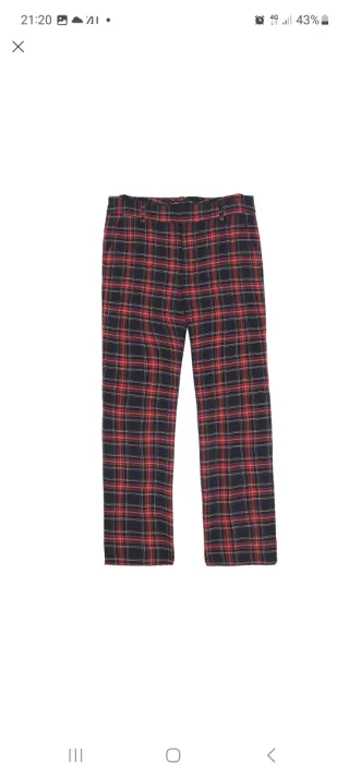 Pantalón de tiro medio con bolsillos frontales y falsos bolsillos en la espalda. Bajo con aberturas laterales interiores. Cierre frontal con cremallera, botón interior y gancho metálico. Con un diseño de cuadros clásico, negro y rojo.