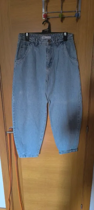 Pantalón vaquero estilo The Baggy de Zara. - Corte recto y holgado. - Tiro alto. - Cierre de cremallera y botón.