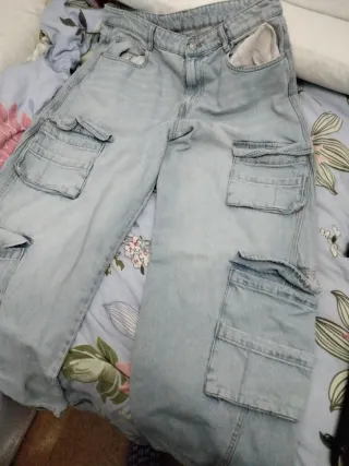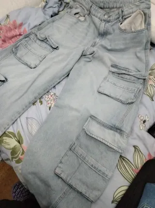 Pantalón estilo cargo de Zara en color azul claro. Diseño moderno y cómodo. - Bolsillos laterales amplios. - Cintura con trabillas para cinturón. - Cierre de cremallera y botón.