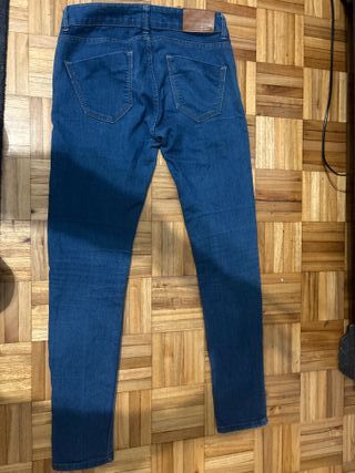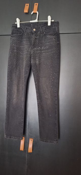 Pantalón vaquero de corte recto con detalles de pedrería. - Diseño con pedrería plateada. - Cintura media. - Cierre de cremallera y botón. Ideal para estas fiestas e ir arreglada informal. Es una talla 36, talla holgado, pero es para llevar algo flojo, a mi ahora me queda justo y no me gusta, por eso lo vendo.