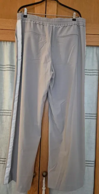 Pantalón ancho de color gris con una banda lateral blanca. - Cintura elástica. - Pierna ancha.